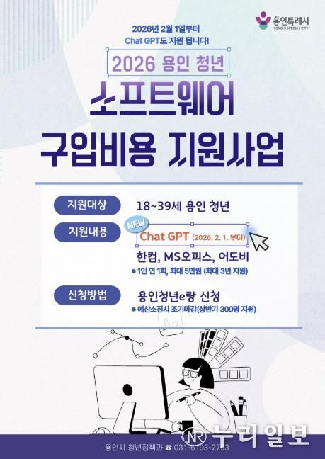 (누리일보) 용인특례시는 청년들의 디지털 역량 강화를 위해 ‘청년 소프트웨어 구입비용 지원사업’ 대상 품목에 ‘ChatGPT Plus’를 추가했다고 2일 밝혔다.