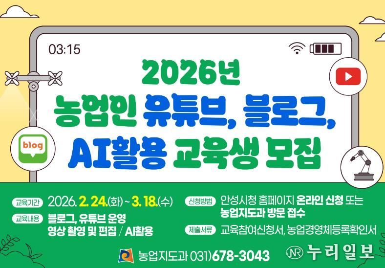 (누리일보) 안성시농업기술센터는 지역 농업인의 디지털 매체 활용 능력을 높이고 농산물 홍보 역량을 강화하기 위해 ‘2026년 농업인 유튜브·블로그·AI 활용 교육’ 교육생을 모집한다. 이번 교육은 블로그 운영뿐만 아니라 인공지능(AI)과 유튜브 동영상을 접목한 실전형 교육 과정으로 구성됐다.