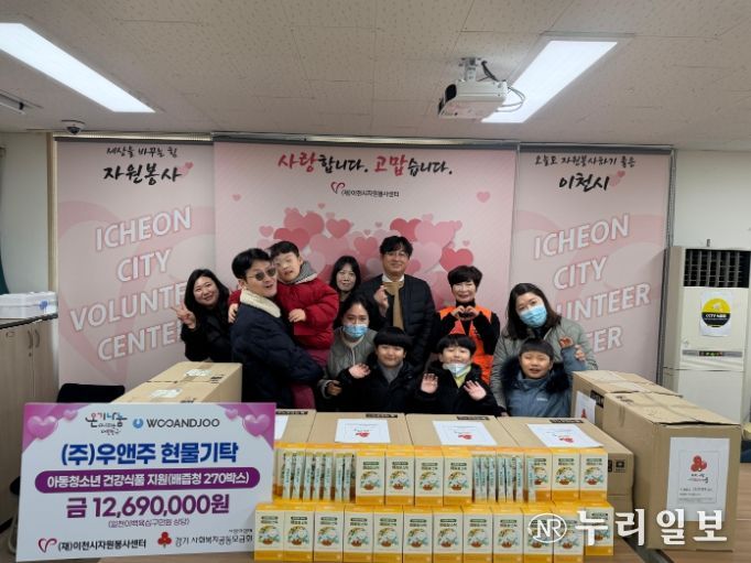 (주)우앤주는 연말연시 집중 자원봉사 기간을 맞아 배즙청 270박스(약 1,270만 원 상당)를 경기사회복지공동모금회를 통해 이천시자원봉사센터에 기탁했다. 기탁된 물품은 이천시 국공립 장애아동 어린이집인 해누리어린이집을 비롯해 관내 아동·청소년들에게 전달되어 겨울철 건강 관리에 도움을 줄 예정이다.