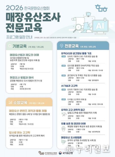 교육은 2월 5일 실시하는 ‘매장유산법과 제도의 이해’를 시작으로 3개 분야 9개 과정에 걸쳐 총 12회 진행된다. 매장유산 법령의 이해부터 현장조사 방법과 해석, 유적 지리정보시스템(GIS)과 공간정보 활용, 인공지능(AI) 기술과 고고학, 유물 보존 및 관리의 이해, 매장유산 콘텐츠 제작과 활용 체험 등 실무 전반을 아우르는 과정으로 구성됐다.