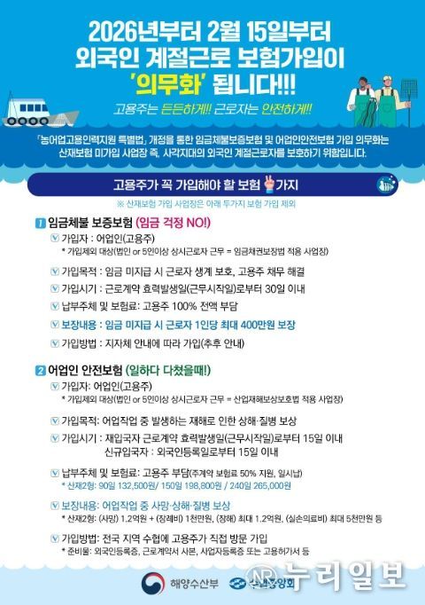 (누리일보) 해양수산부는 2월 4일 정부세종컨벤션센터에서 외국인 계절근로자에 대한 임금 지급과 상해・질병 보상을 두텁게 보장하는 내용 등의'농어업고용인력 지원 특별법'개정 법률에 대한 설명회를 개최한다고 밝혔다. 이번 설명회는 법 개정으로 달라지는 주요 내용에 대해 지방정부 담당자, 수협, 어업인 등의 이해를 돕기 위해 마련됐다.