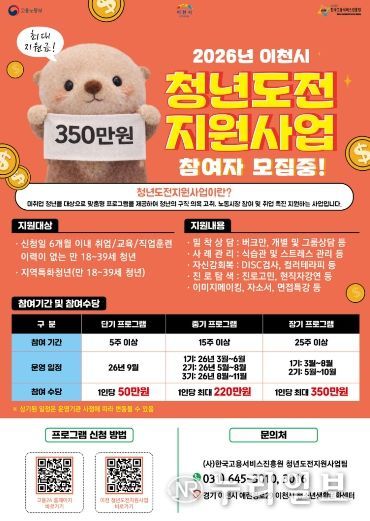 (누리일보) 이천시는 지역 내 미취업 청년들의 진로 탐색과 취업역량 강화를 위해 운영하는 ‘청년도전지원사업’의 참여자를 2월 4일부터 모집한다고 밝혔다.