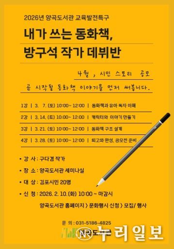 (누리일보) 김포시 양곡도서관은 오는 3월 7일부터 3월 28일까지 매주 토요일, 시민을 대상으로 한 그림책 글쓰기 수업 '내가 쓰는 동화책, 방구석 작가 데뷔반'을 운영한다.