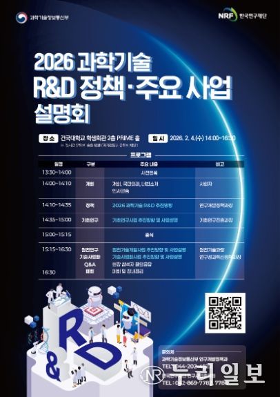 (누리일보) 과학기술정보통신부는 2월 4일 오후 2시 건국대학교 학생회관 2층 PRIME홀에서 ‘2026 과학 기술 연구개발(R&D) 정책·주요 사업 설명회’를 개최했다고 밝혔다.