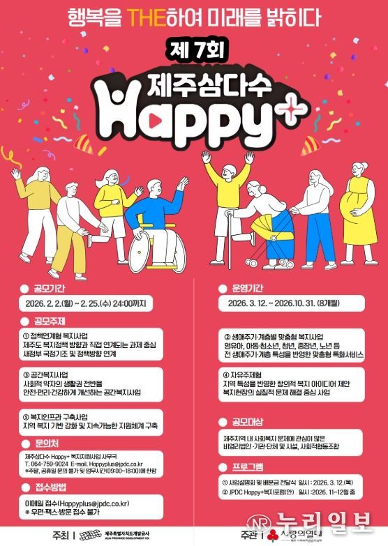 (누리일보) 제주삼다수를 생산·유통하는 제주특별자치도개발공사(사장 백경훈)는 도내 복지 사각지대 해소를 위한 혁신적인 아이디어를 발굴하는 ‘제7회 제주삼다수 Happy+ 복지 지원사업’의 공모 접수가 오는 25일 마감된다고 밝히며, 도내 역량 있는 단체들의 적극적인 참여를 독려했다.