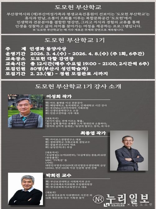 (누리일보) 부산시는 과거 시장 관사에서 시민을 위한 복합문화공간으로 재탄생한 '도모헌'에서 시민들의 삶에 깊이를 더하고 인생 2막의 이정표를 제시하는 '2026년 도모헌 부산학교 프로그램'을 본격 운영한다고 밝혔다.