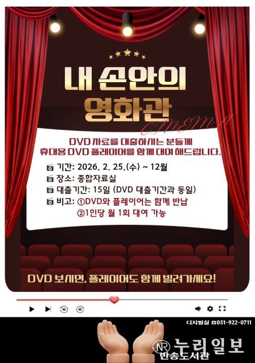 (누리일보) 부산시교육청 반송도서관은 DVD 자료 이용 활성화를 위해 25일부터 12월까지 ‘내 손안의 영화관’ 프로그램을 운영한다.