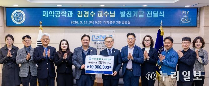 (누리일보) 경상국립대학교는 3월 17일 오전 9시 30분 대학본부 3층 접견실에서 김경수 국제협력부처장(제약공학과 교수)의 대학발전기금 전달식을 개최했다.