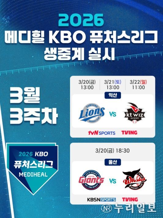 (누리일보) KBO는 3월 20일(금) 개막하는 2026 메디힐 KBO 퓨처스리그 경기를 TV 채널 tvN SPORTS, KBSN SPORTS와 OTT 플랫폼 TVING을 통해 생중계 한다.