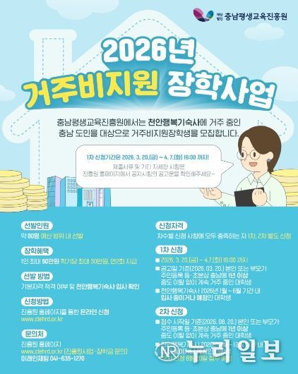 (누리일보) 충남평생교육진흥원이 지역 대학생의 주거비 부담 완화와 안정적인 학업 환경 조성을 위해 대학생 거주비지원사업을 확대해 추진한다고 20일 밝혔다.