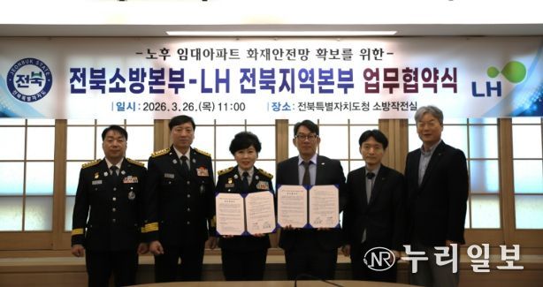 (누리일보) 전북특별자치도소방본부(본부장 이오숙)는 26일 도청 17층 소방작전실에서 LH 전북지역본부와 노후 임대아파트 화재안전망 확보를 위한 업무협약을 체결했다고 밝혔다.
