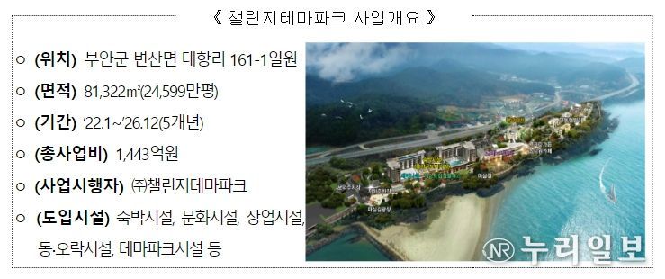 ‘새만금 챌린지테마파크 개발사업‘은 총사업비 1,443억 원을 투자하여 문화시설을 건설하는 사업으로, 올해 안에 착공, 2026년 말 준공하여 2027년부터 본격 운영될 예정이다.