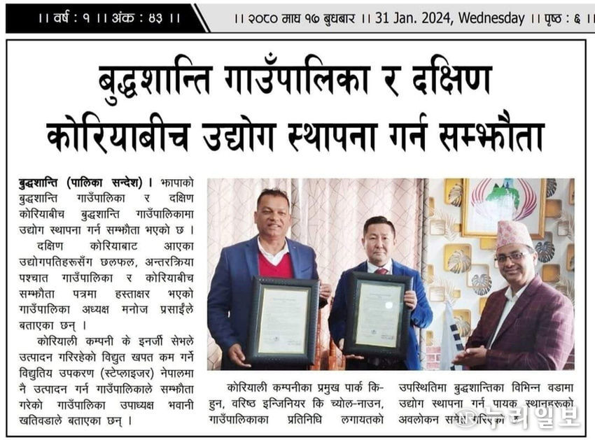 이어 강유주 대표는 “네팔 정부가 케이에너지세이브 공장 설립부지 제공, 정책자금 지원, 세제 혜택 등을 지원받는 조건을 제시해 감사하다”며 “네팔을 시작으로 아시아는 물론 전 세계에 최고의 전기 절감기를 수출함으로써 탄소중립과 에너지 절감의 큰 시장을 변화해 나가는 데 앞장서겠다”고 밝혔다.