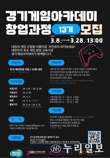 (누리일보) 경기도와 경기콘텐츠진흥원이 ‘2024년 경기게임아카데미 창업과정 13기’ 사업에 참여할 예비 게임창업팀을 오는 28일까지 모집한다.