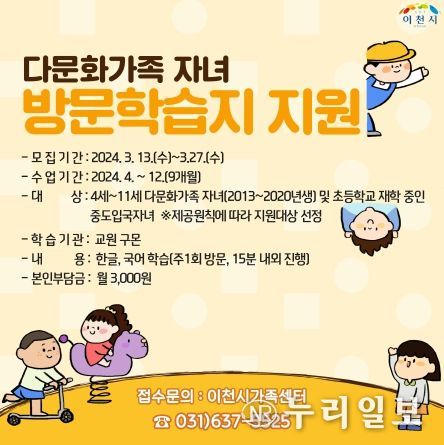 (누리일보) 이천시는 다문화가족 자녀의 한국어 방문 학습을 지원하는 “2024 다문화가족 자녀 방문학습지 지원사업”을 교육전문업체인 ㈜교원구몬과 함께 4월부터 12월까지 9개월 동안 제공한다고 밝혔다.