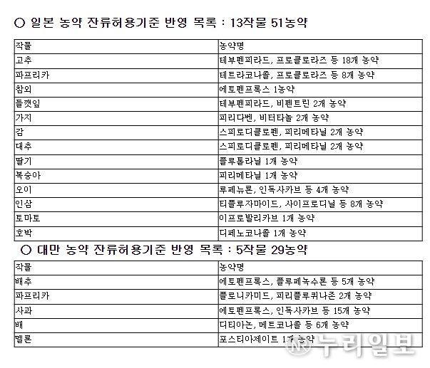한편, 농촌진흥청은 농산물 수출을 지원하기 위해 2006년부터 지금까지 일본, 대만 정부와 협의해 이들 나라에 수출하는 18개 농산물에 대한 80건의 농약 잔류허용기준을 설정했다.
