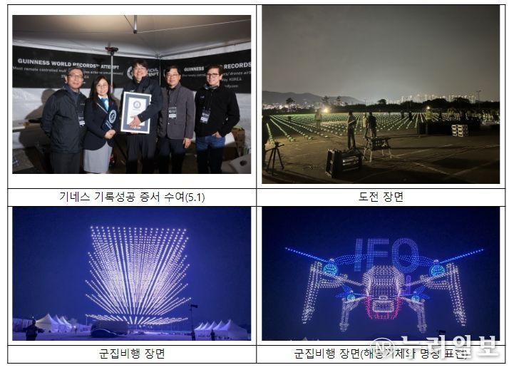 (누리일보) 국토교통부와 항공안전기술원(원장 이대성)은 5월 1일 새벽, 국내 드론기업이 세계 최대규모 드론(5,293대)으로 군집비행 기네스 기록 달성에 성공했다고 밝혔다.