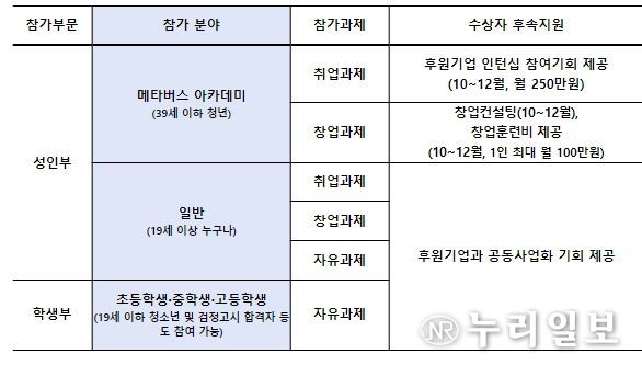 특히, 성인부에 신설된 메타버스 아카데미 분야의 경우 추가적인 혜택 및 후속지원이 이루어진다. 먼저, 본선 진출팀에게는 교육훈련비(1인 최대 100만원)가 지원된다. 또한, 최종 취업과제 수상자에게는 후원기업 인턴십(10~12월, 월 250만원)이, 최종 창업과제 수상자에게는 창업컨설팅과 창업훈련비(3개월, 1인 월 100만원)를 제공하는 등 실제 취·창업이 이루어지도록 적극 지원할 예정이다.