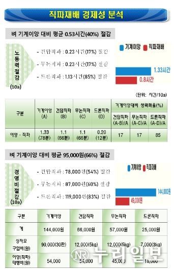 충청남도농업기술원 조사 결과, 기존 모내기 방법보다 드론담수산파 83%, 무논점파 60%, 건답점파 54% 경영비가 절감되는 것으로 나타났다.