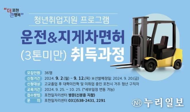 (누리일보) ‘청년들이 살기 좋은 도시, 살고 싶은 도시’ 조성을 목표로 다양한 사업을 추진하고 있는 포천시가 오는 12일까지 청년 취업지원 프로그램 ‘운전·지게차 면허 취득 교육과정’에 참여할 청년을 모집한다.