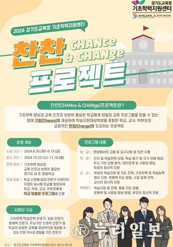 (누리일보) 경기도교육청 기초학력지원센터는 10월 23일부터 11월 18일까지 경기도 초·중등 8개교를 대상으로‘찬찬(CHANce & CHANge) 프로젝트’를 운영한다. 찬찬 프로젝트는 교육 인프라가 부족한 지역의 학교 구성원들이 전문가의 상담과 교육‘기회(chance)’를 활용하여 학습을 중심으로 한 긍정적 변화(change)’를 추구하는 프로그램이다.