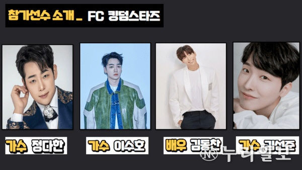 남자팀 FC 킹덤스타즈는 ‘정통트롯 황태자’로 불리는 정다한이 주장을 맡아 팀을 이끌며, 재강,양승호, 정해준, 이수호, 김선준, 금강, 김동찬, 성용하, 강설민, 김영기, 권용태, 이윤신,황인성 등 개성 넘치는 멤버들이 함께한다. 풋살 경기를 통해 그들의 새로운 면모를 팬들에게 선보일 예정이다.
