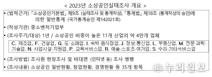 (누리일보) 중소벤처기업부와 소상공인시장진흥공단(이사장 박성효)은 27일 '2023년 소상공인실태조사'의 잠정결과를 발표했다. 소상공인실태조사는 소상공인·자영업자 지원정책 수립을 위한 기초자료로 활용되며, 매년 시행되고 있다.
