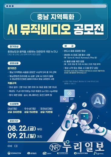 (누리일보) 충남콘텐츠진흥원이 운영하는 충남음악창작소가 ‘충남 지역특화 AI 뮤직비디오 공모전’ 참가자를 모집한다고 22일 밝혔다.