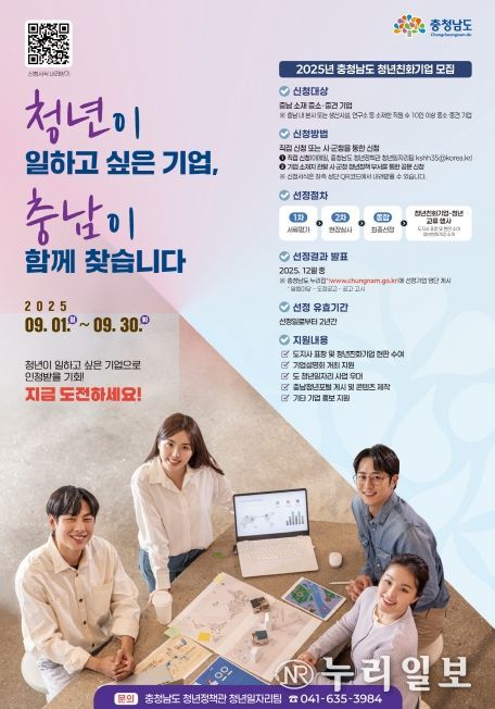 (누리일보) 충남도는 청년 눈높이에 맞는 고용 환경을 조성하고 청년 친화적 기업 문화 확산을 위해 ‘2025년 충청남도 청년친화기업’을 9월 1일부터 9월 30일까지 모집한다고 25일 밝혔다.