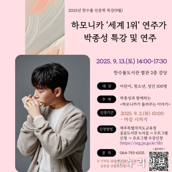 (누리일보) 제주도교육청 한수풀도서관은 오는 13일 오후 2시부터 5시 30분까지 별관 강당에서 인문학 특강 ‘하모니카가 들려주는 이야기’를 개최한다.