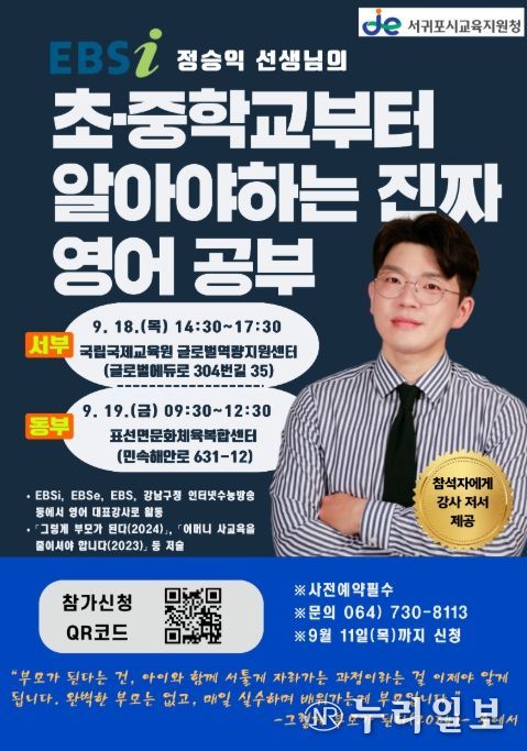 (누리일보) 서귀포시교육지원청은 오는 18일과 19일 양일간 서귀포시 지역 보호자 150여 명을 대상으로 찾아가는 학부모 연수 ‘초·중학교부터 알아야 하는 진짜 영어공부’프로그램을 운영한다.
