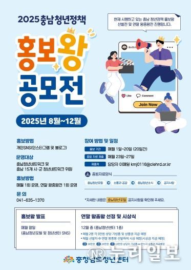 (누리일보) 충청남도 내 청년정책을 널리 알리고 청년들의 적극적인 참여를 유도하기 위한 ‘2025 충남 청년 정책 홍보왕 공모전’이 활발히 진행되고 있다.