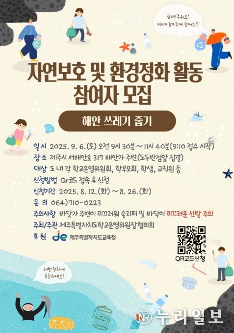 (누리일보) 제주특별자치도학교운영위원장협의회는 6일 오전 9시 30분 제주시 도두동 해안가 일대에서 학교운영위원회와 학부모회 회원 100여 명이 참여하는 ‘2025학년도 자연보호 및 환경정화 활동’을 실시한다.
