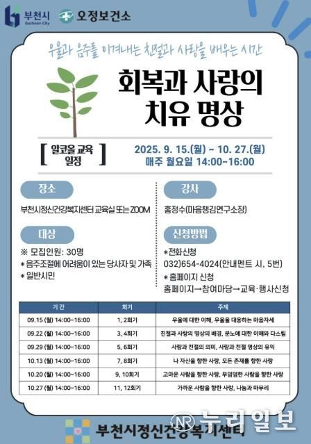 (누리일보) 부천시는 9월 15일부터 10월 27일까지 부천시정신건강복지센터와 함께 알코올 사용으로 인한 우울감과 감정 조절 문제를 겪는 시민을 돕기 위해 매주 월요일 ‘회복과 사랑의 치유 명상’을 주제로 알코올 교육 프로그램을 운영한다.