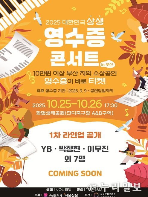 콘서트는 10월 25일부터 26일까지 화명생태공원에서 열리며, 부산 지역 소상공인 결제 영수증(10만 원 이상)을 공연 관람권(티켓)으로 인정하는 전국에서 유일한 상생형 문화 축제로, 단순한 공연 관람을 넘어 소비와 문화가 결합한 새로운 축제 모델을 선보인다.