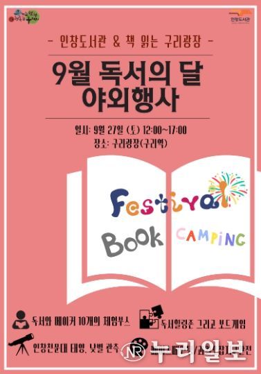 (누리일보) 구리시 인창도서관은 9월 독서의 달을 맞아 오는 9월 27일 오후 12시부터 5시까지, 시민 누구나 참여할 수 있는 야외 독서문화 행사 『책 읽는 구리광장』을 운영한다고 밝혔다.