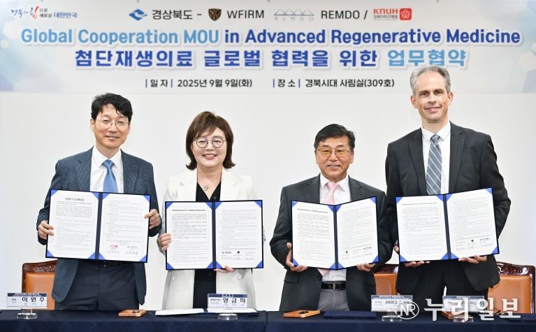 (누리일보) 경상북도는 9일 세계지식포럼 연사자로 방한한 미국 웨이크포레스트 의과대학교 재생의학연구소(Wake Forest Institute for Regenerative Medicine, WFIRM) 부소장 제임스 유 박사와 재생의료개발기구(ReMDO) 대표인 테리 윌리엄스와의 함께 ‘첨단재생의료 글로벌 협력’을 위한 상호 협력 양해각서(MOU)를 체결했다.