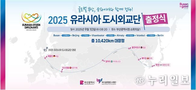 (누리일보) 부산시와 부산글로벌도시재단은 '2025 유라시아 도시외교단'이 글로벌 허브도시 부산 브랜드를 홍보하고 자매·우호도시와 교류 협력하기 위해 오늘(10일)부터 9월 25일까지 총 16일간의 여정을 떠난다고 밝혔다.