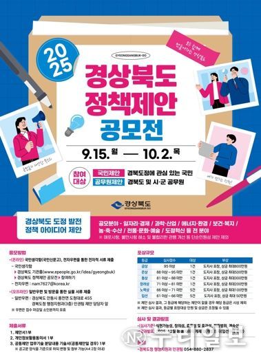 (누리일보) 경상북도는 9월 15일부터 10월 2일까지 다양하고 창의적인 아이디어를 발굴해 도정 발전과 제도 개선에 반영하기 위해 ‘2025년 경상북도 정책 제안 공모전’을 개최한다.