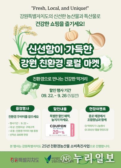 (누리일보) 강원특별자치도는 9월 22일부터 26일까지 5일간 두레생협 전국 111개 매장에서 '강원특별자치도 친환경 로컬마켓 2탄'을 동시에 개최한다고 밝혔다.