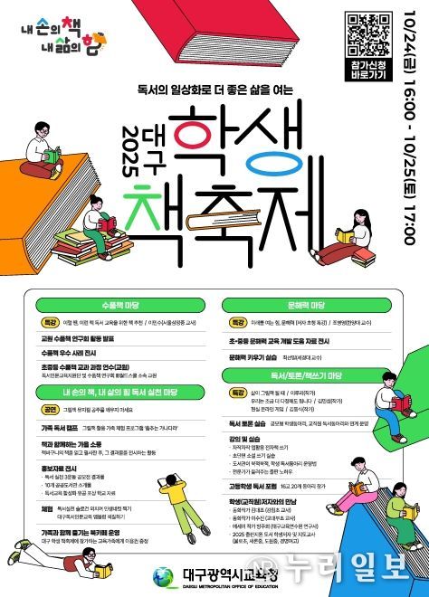 (누리일보) 대구시교육청은 독서인문교육 소통의 장을 마련하기 위해 10월 24일부터 25일까지 대구민주시민교육센터와 대구2․28기념학생도서관에서 ‘2025. 대구 학생 책축제’를 개최한다.