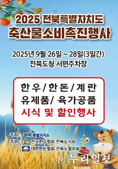 (누리일보) 전북특별자치도가 추석 명절을 맞아 도민들에게 안전하고 품질 좋은 축산물을 저렴하게 제공하기 위해 ‘2025년 축산물 소비촉진행사’를 연다. 도는 이번 행사를 9월 26일부터 28일까지 사흘간 도청 서편광장에서 개최한다고 23일 밝혔다.