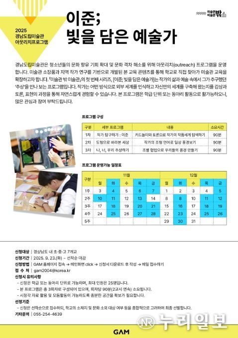 이번 프로그램은 경남을 대표하는 추상회화의 거장 '이준'의 삶과 작품세계를 중심으로 구성되며, 도내 초·중·고등학교 7곳을 대상으로 총 3회차에 걸쳐 진행된다.