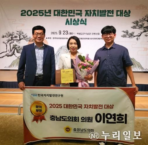 (누리일보) 충남도의회 이연희 의원(서산3·국민의힘)이 23일 백범 김구 기념관에서 열린 '2025년 대한민국 자치발전 대상' 시상식에서 광역의회 의원부문 수상자로 선정됐다.