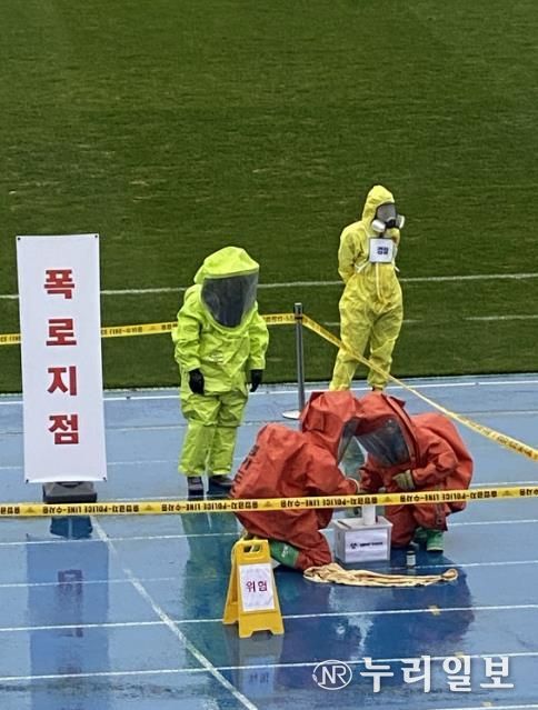 생물테러 의심 사건 발생을 가정해 실제 대응 절차와 동일하게 훈련했다. ▲신고 접수와 상황 전파 ▲초동 조치팀 현장 출동 ▲구조와 구호활동 ▲다중탐지키트 검사 ▲통제선 확대 ▲응급진료소 설치 ▲노출자 이송 및 제독 등으로 이뤄졌다.