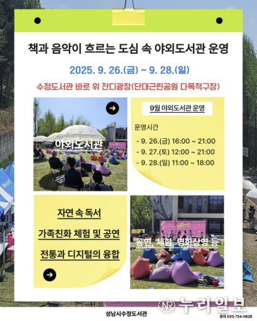 (누리일보) 성남도시개발공사 수정도서관은 오는 9월 26일부터 28일까지 ‘제3회 책과 음악이 흐르는 도심 속 야외도서관’을 개최한다고 25일 밝혔다.