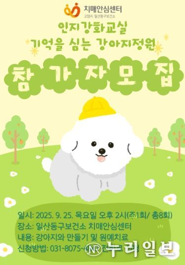 (누리일보) 고양특례시 일산동구보건소 치매안심센터는 원예치료 및 동물매개치료를 적용한 인지강화교실 ‘기억을 심는 강아지정원’에 참여할 참가자를 모집한다고 25일 밝혔다.