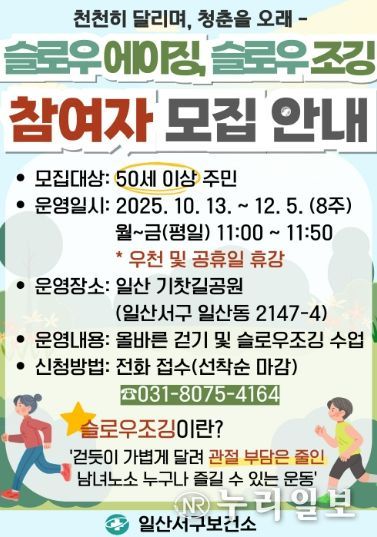 (누리일보) 고양특례시 일산서구보건소는 10월 13일부터 12월 5일까지(8주간) 진행되는 ‘슬로우에이징·슬로우조깅’ 프로그램 참여자를 모집한다고 밝혔다.