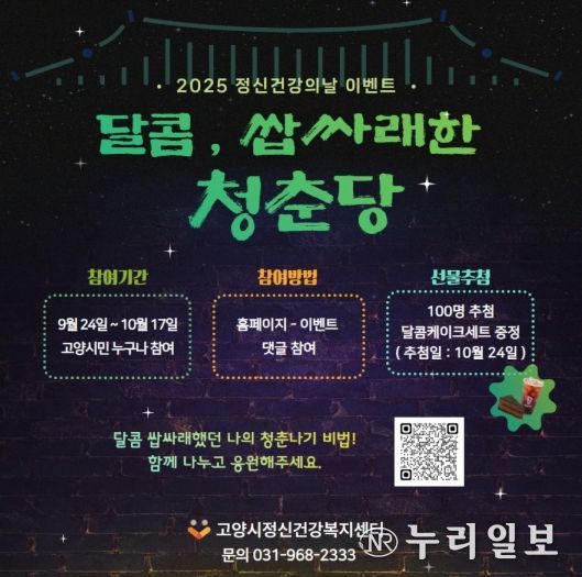 (누리일보) 고양시정신건강복지센터 초발정신건강사업팀은 10월 10일 정신건강의 날을 기념해 고양시민 및 청년을 대상으로 ‘달콤, 쌉싸래한 청춘당’ 온라인 캠페인을 10월 17일까지 진행한다.