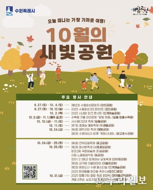 이재준 수원특례시장은 “시민들이 공원을 언제든지 편하게 찾고 다양한 프로그램을 즐길 수 있도록 꾸준히 발전시키겠다”며 “10월 한 달 동안 공원 곳곳에서 열리는 마을축제와 문화 행사가 시민들에게 가장 가까운 여행이 되길 바란다”고 밝혔다.